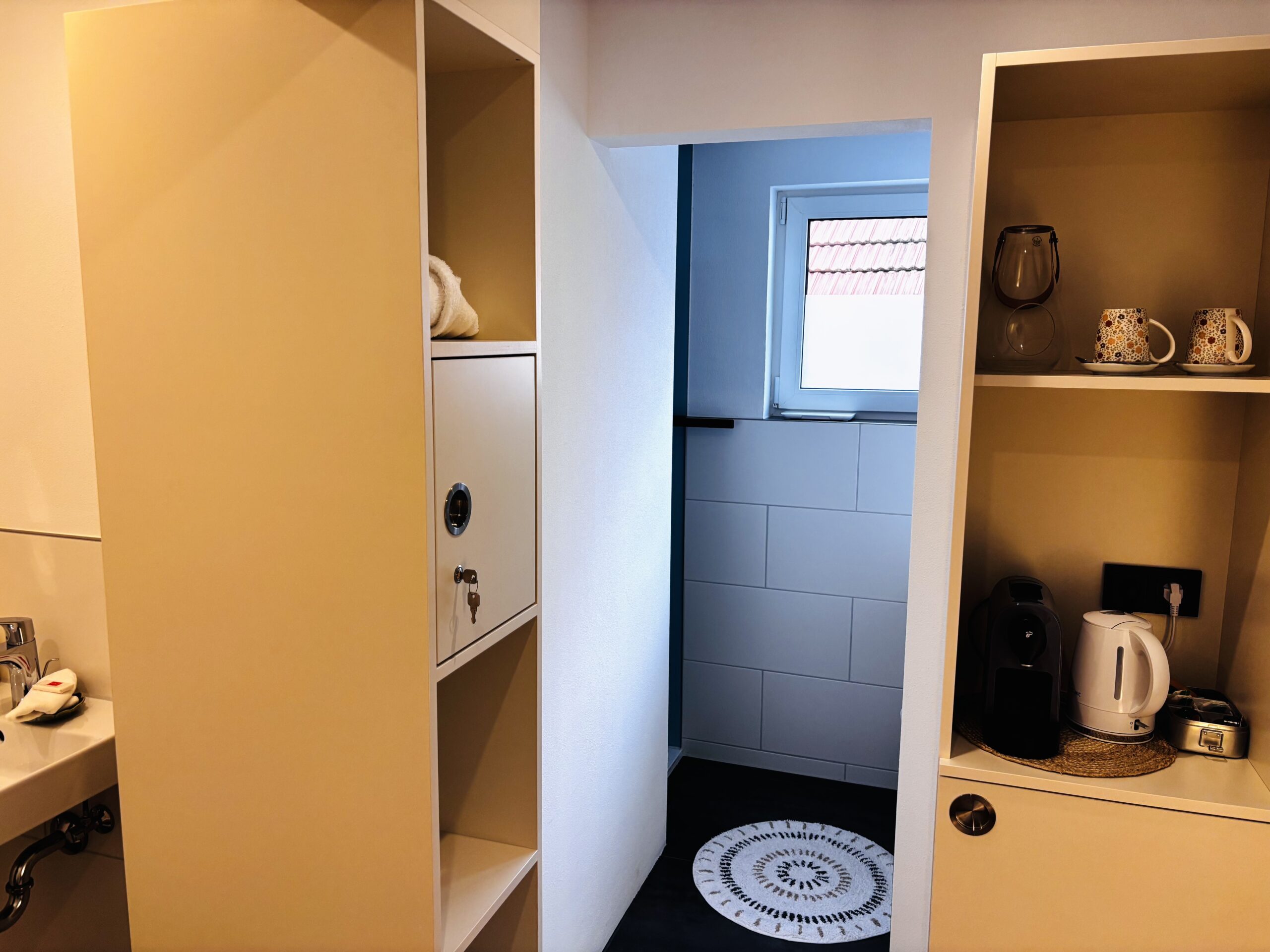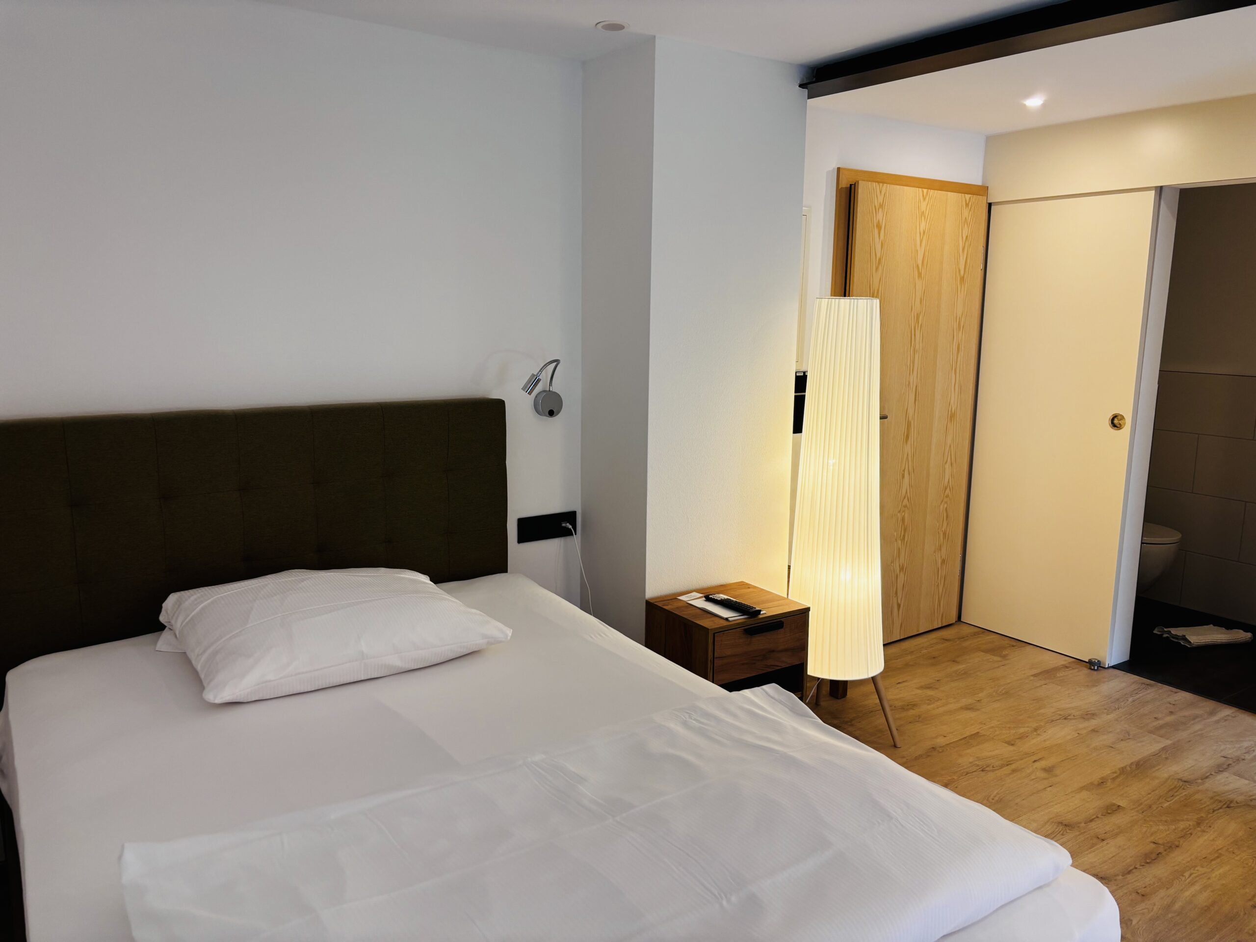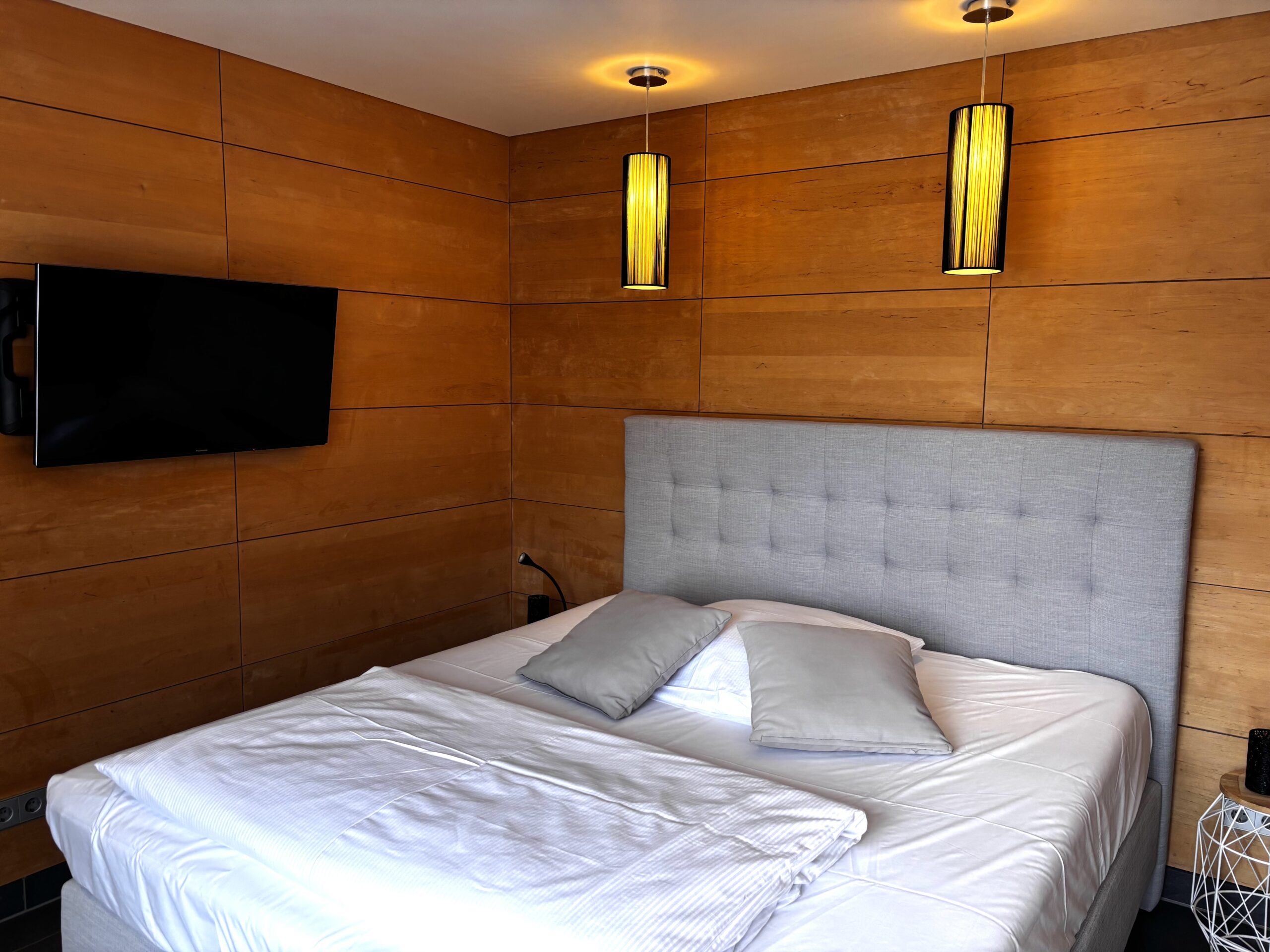 Our Sky Room combines modern design with atmosphere. Warm wood tones create a stylish ambience. The highlight is the private roof terrace, from which you can enjoy a magnificent view over Dettingen.