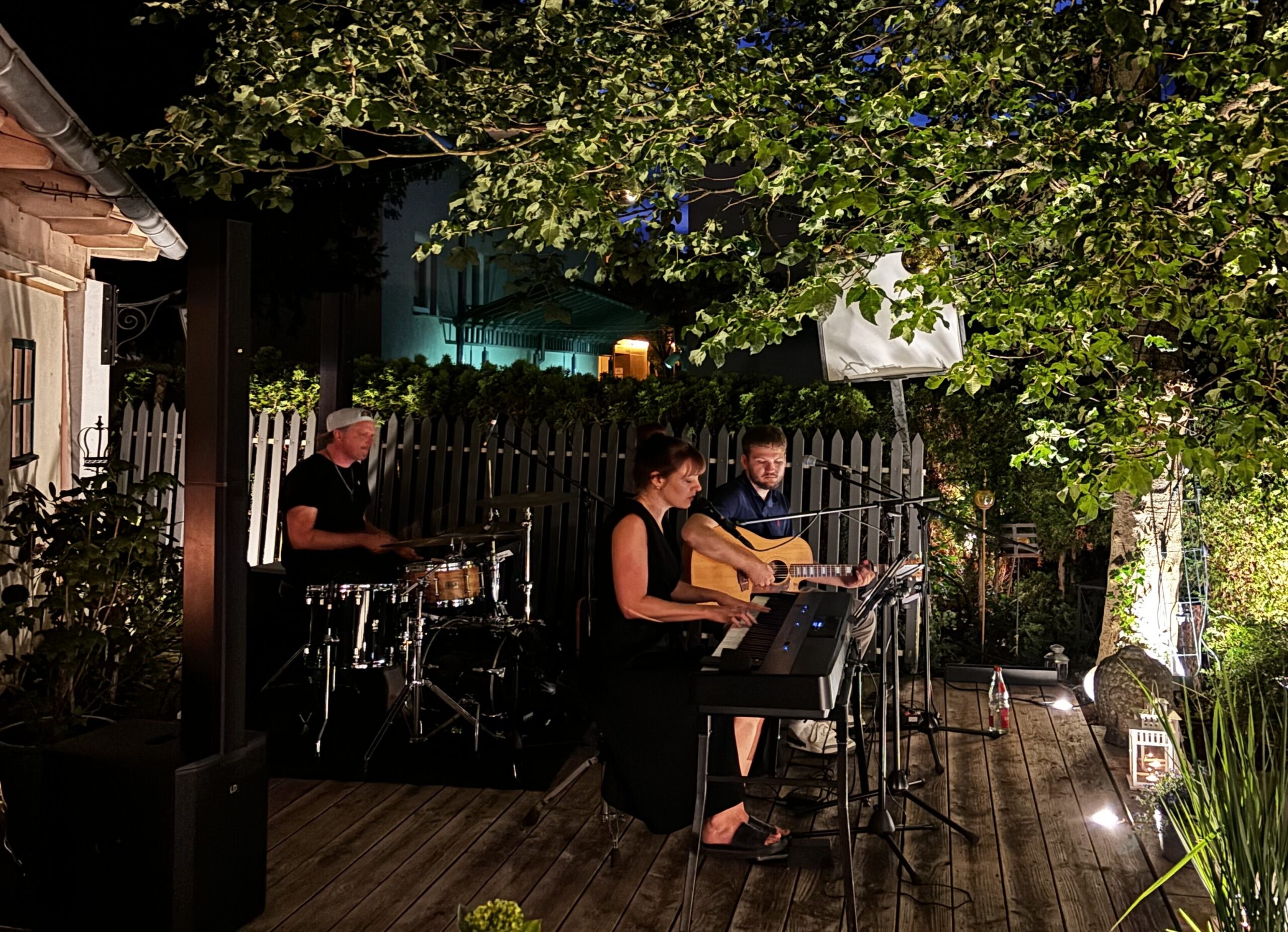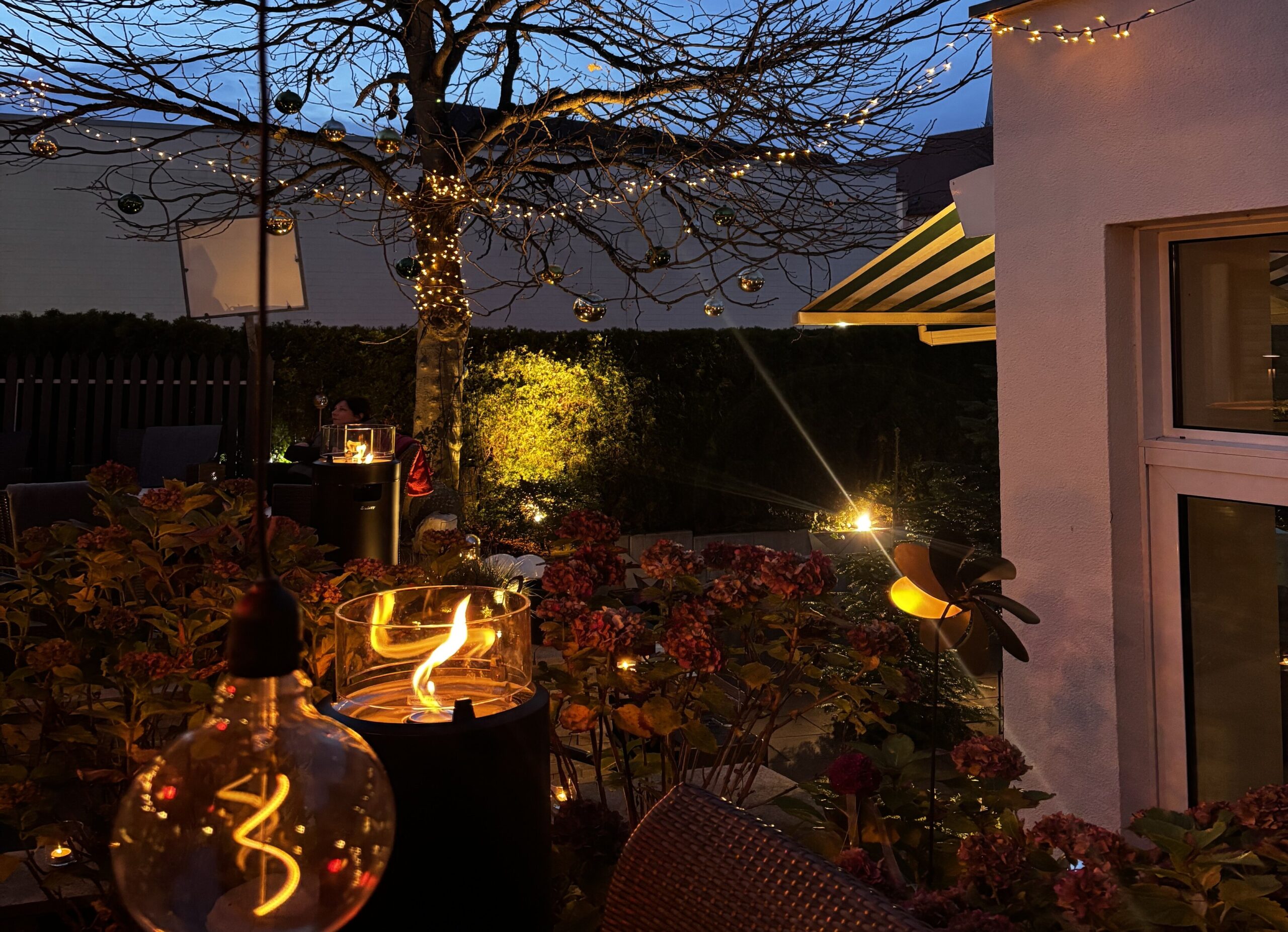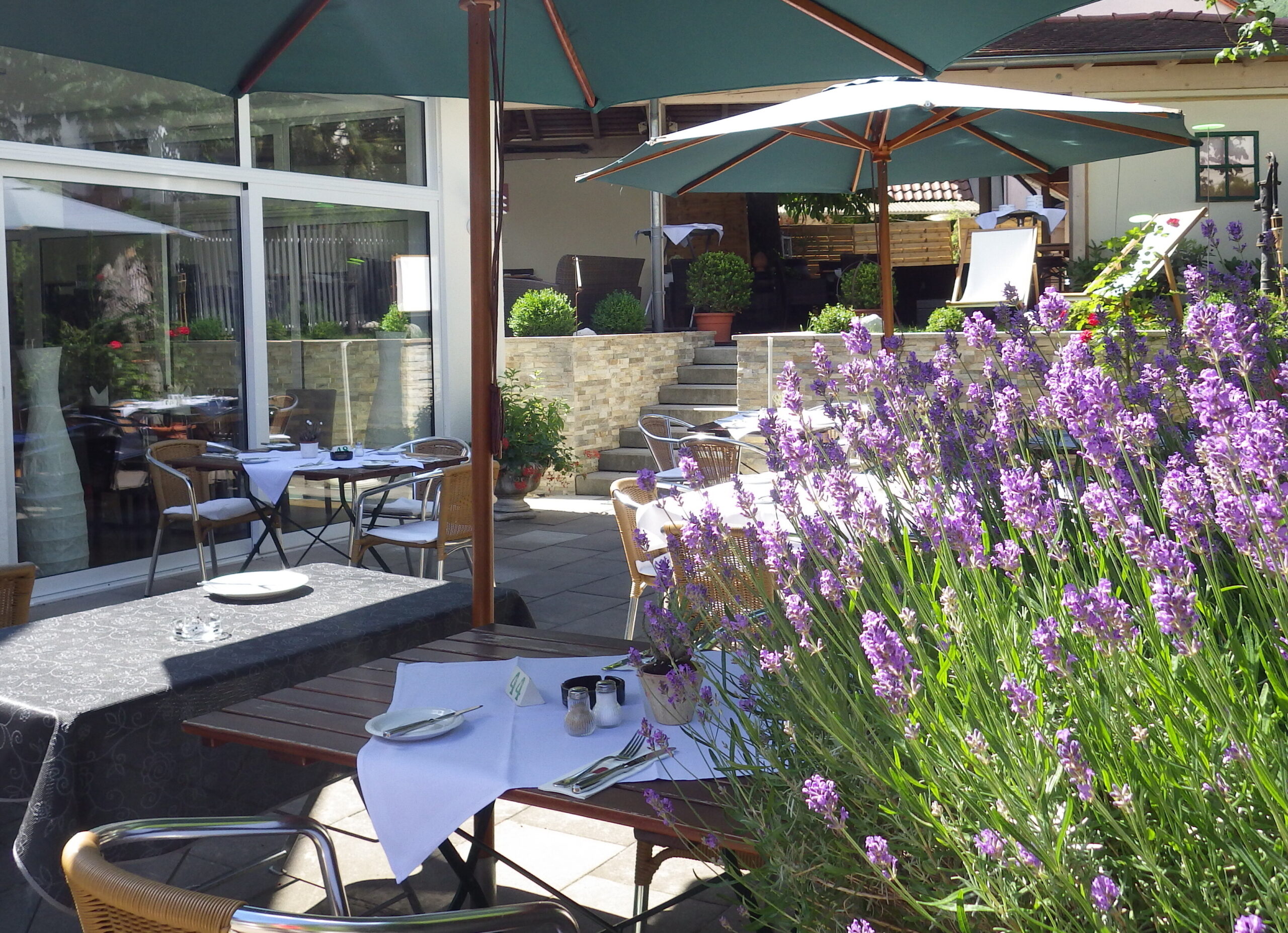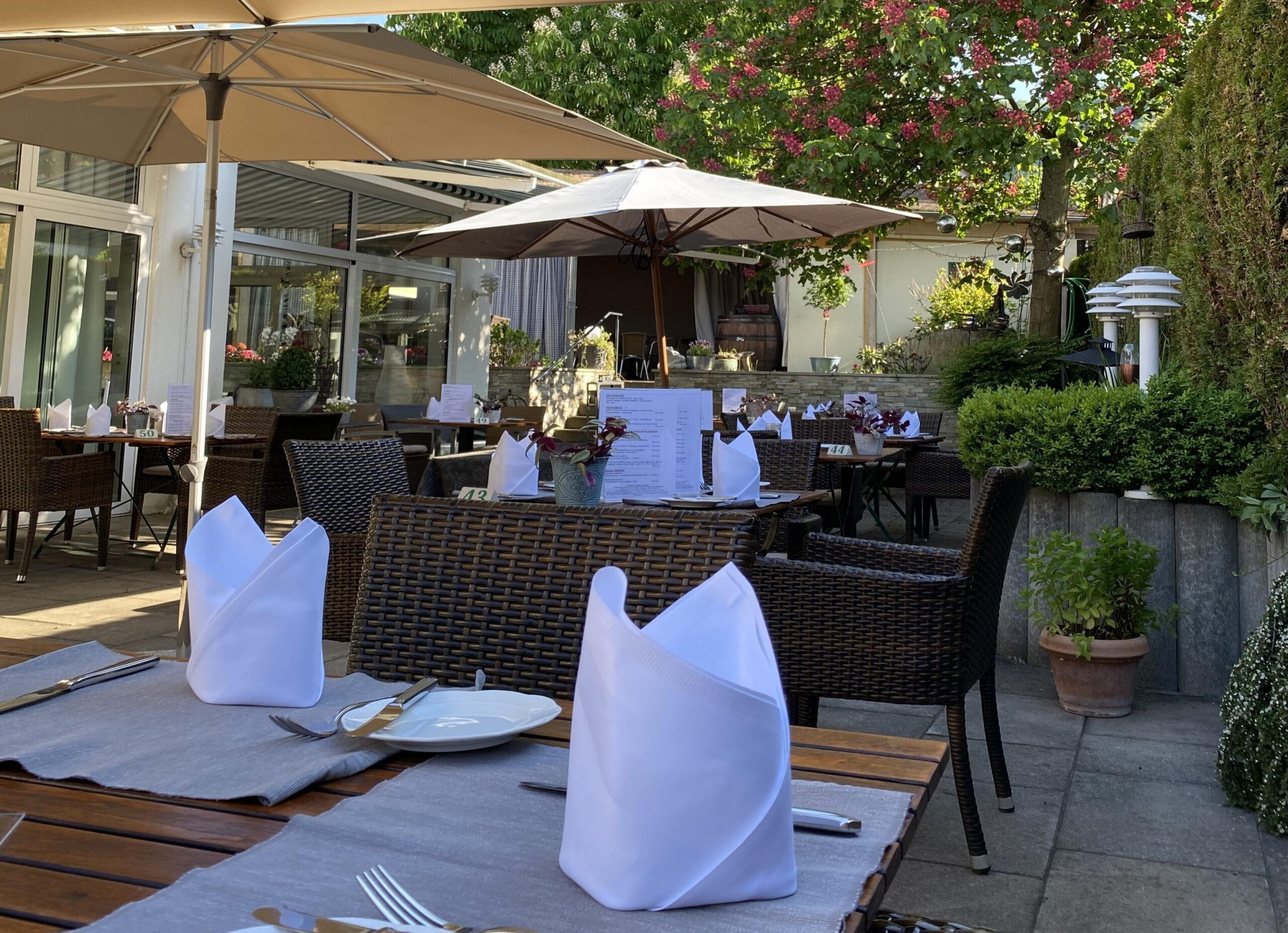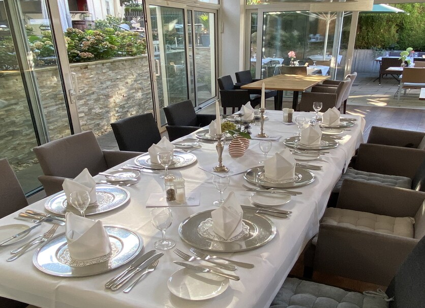 Traumhaft präsentiert sich die großzügige Gartenterrasse, die sich direkt an den Wintergarten anschließt. Im Sommer ist sie ideal für Feste und Feierlichkeiten mit bis zu 50 Gästen, ergänzt durch unsere Lounge für Feiern unter dem Kastanienbaum.