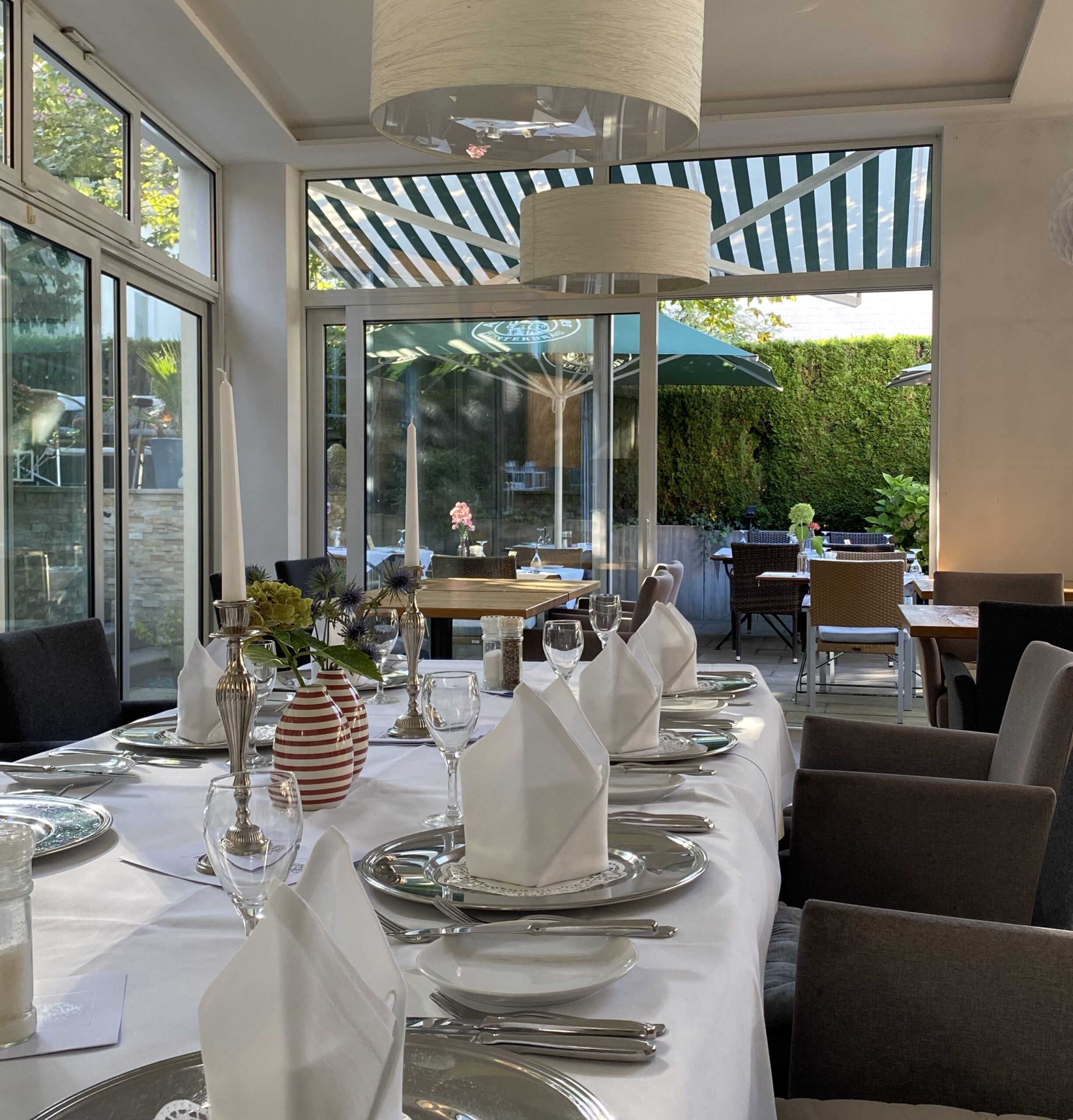Traumhaft präsentiert sich die großzügige Gartenterrasse, die sich direkt an den Wintergarten anschließt. Im Sommer ist sie ideal für Feste und Feierlichkeiten mit bis zu 50 Gästen, ergänzt durch unsere Lounge für Feiern unter dem Kastanienbaum.